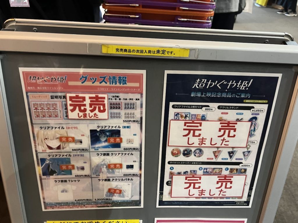 少し遅れて到着。劇場販売グッズは当たり前のように完売。爆発的な人気に制作側が追いついていないイメージ。「どうせ当たらないんだろう」の気持ちで舞台挨拶を抽選したが、当たってよかった。入場特典がメルカリですごい値段で売られてるとか。